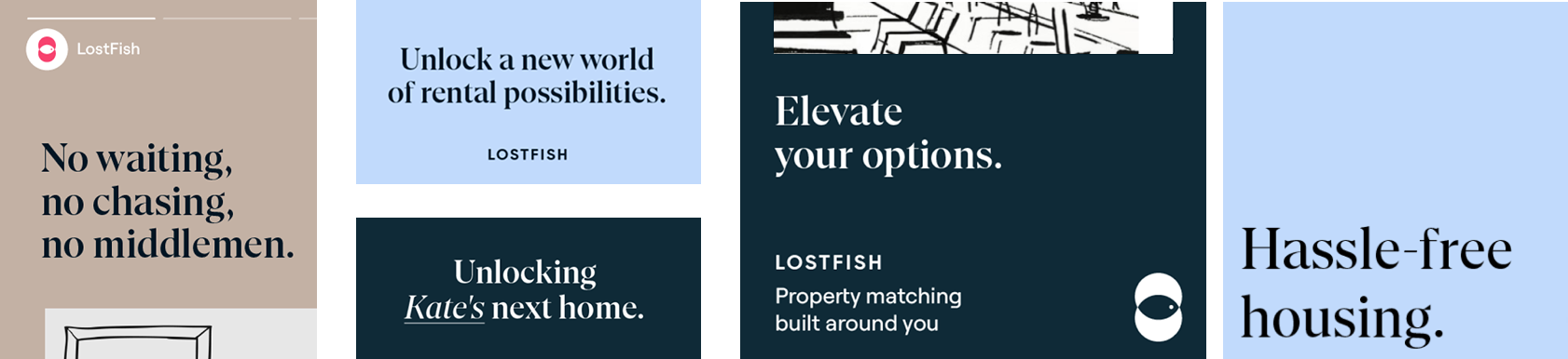 The logo represents the match between property seekers and owners, with Lostfish connecting them seamlessly.