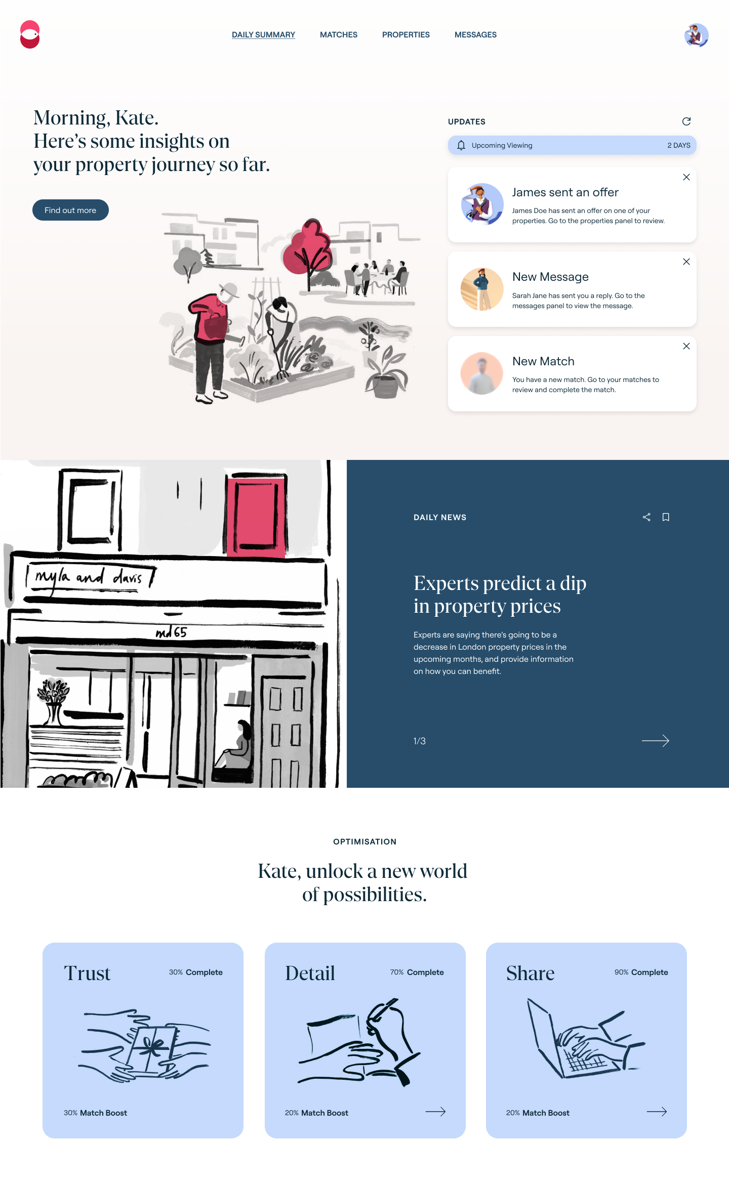 Using illustrations of day-to-day scenes, moments of enjoyment, and calmness at home, we celebrate the brand values, bring sophistication to the experience, and set a clear differentiator in the real estate market.